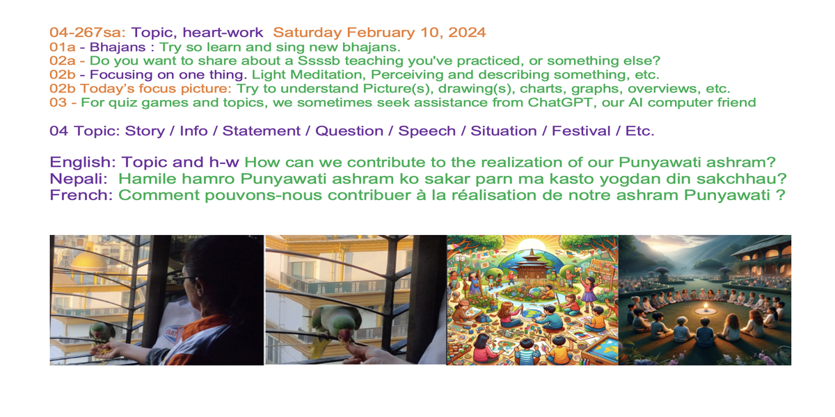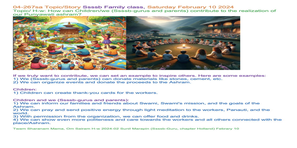 | 04-267sa febr 10 | How can children/we contribute to the realization of our Punyawati ashram? | Let's share our experiences and insights through words and/or creative expression, such as art, poetry, music, drama, or drawings, to inspire each other. | Ssssb-guru Daju (Sunil Marapin). Support team: Gurus and Youth team | Nepal 09:00 - 10:15, Congo 4:15-5:30, India 8:45-10:00, Holland 4:15-5:30, Qatar 06:15-07:30 | Saturday Family class for everyone |