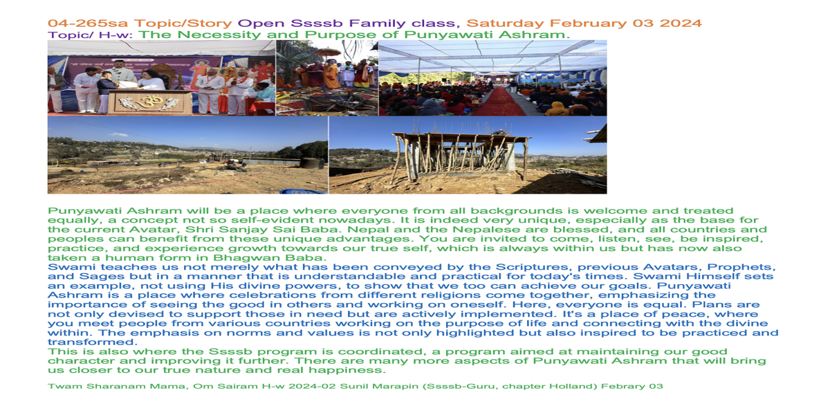 | 04-265sa Febr 03, 2024 | Swami’s Stone-laying ceremony and discourse on November 23, 2023 at Punyawati | Let's share our experiences and insights through words and/or creative expression, such as art, poetry, music, drama, or drawings, to inspire each other. | Ssssb-guru Daju (Sunil Marapin). Support team: Gurus and Youth team | Nepal 09:00 - 10:15, Congo 4:15-5:30, India 8:45-10:00, Holland 4:15-5:30, Qatar 06:15-07:30 | Saturday Family class for everyone |