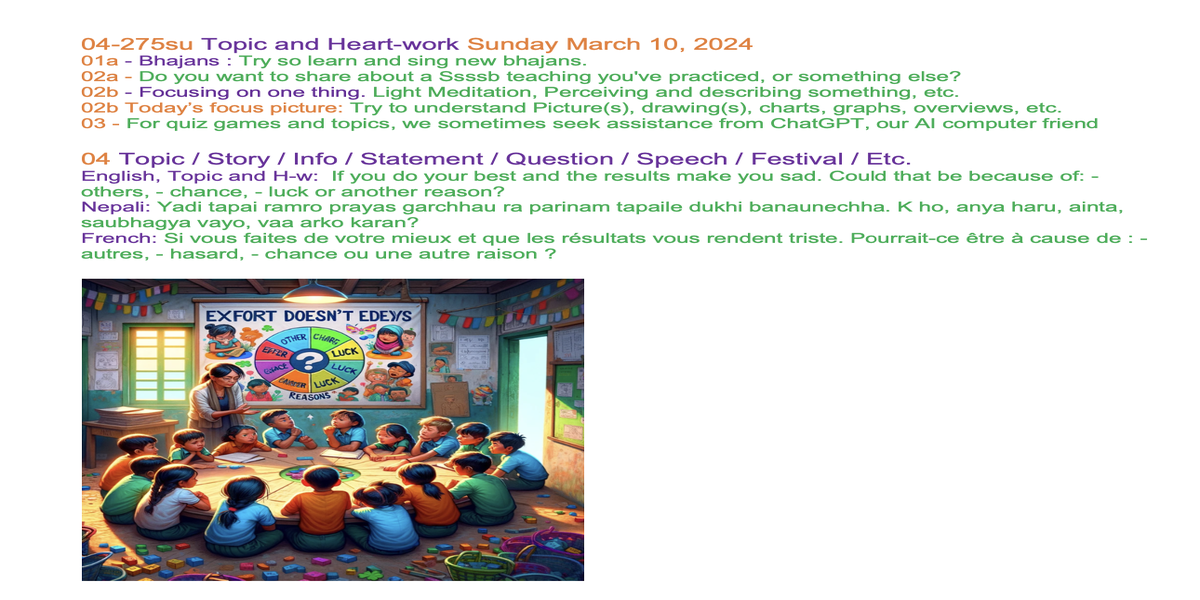| 04-275su March 10 | If you do your best and the results make you sad. Could that be because of: - others, - chance, - luck or another reason? | Let's share our experiences and insights through words and/or creative expression, such as art, poetry, music, drama, or drawings, to inspire each other. | Ssssb-guru Daju (Sunil Marapin) Support team: Gurus and Youth team | Nepal 18:45-20:00, India 18:30-19:45, Congo: 14:00-15:15, Holland 14:00-15:15 | Sunday Family class for everyone |