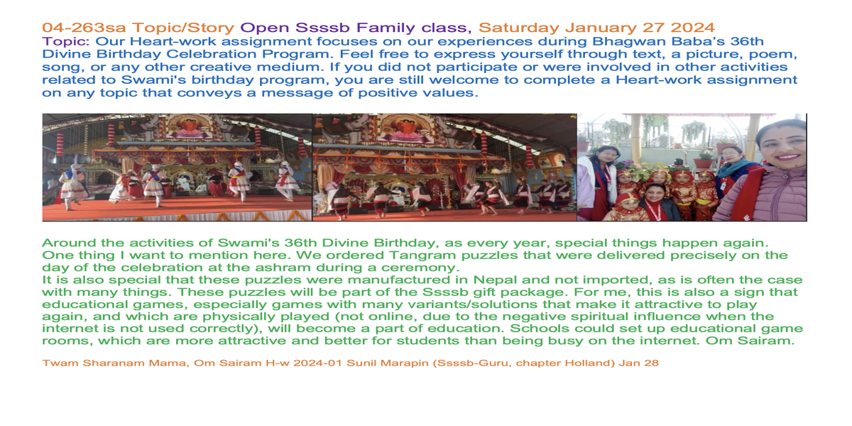 | 04-263sa Jan 27, 2024 | Let's share our impressions of Swami's 36th divine birthday event | Let's share our experiences and insights through words and/or creative expression, such as art, poetry, music, drama, or drawings, to inspire each other. | Ssssb-guru Daju (Sunil Marapin). Support team: Gurus and Youth team | Nepal 09:00 - 10:15, Congo 4:15-5:30, India 8:45-10:00, Holland 4:15-5:30, Qatar 06:15-07:30 | Saturday Family class for everyone |
