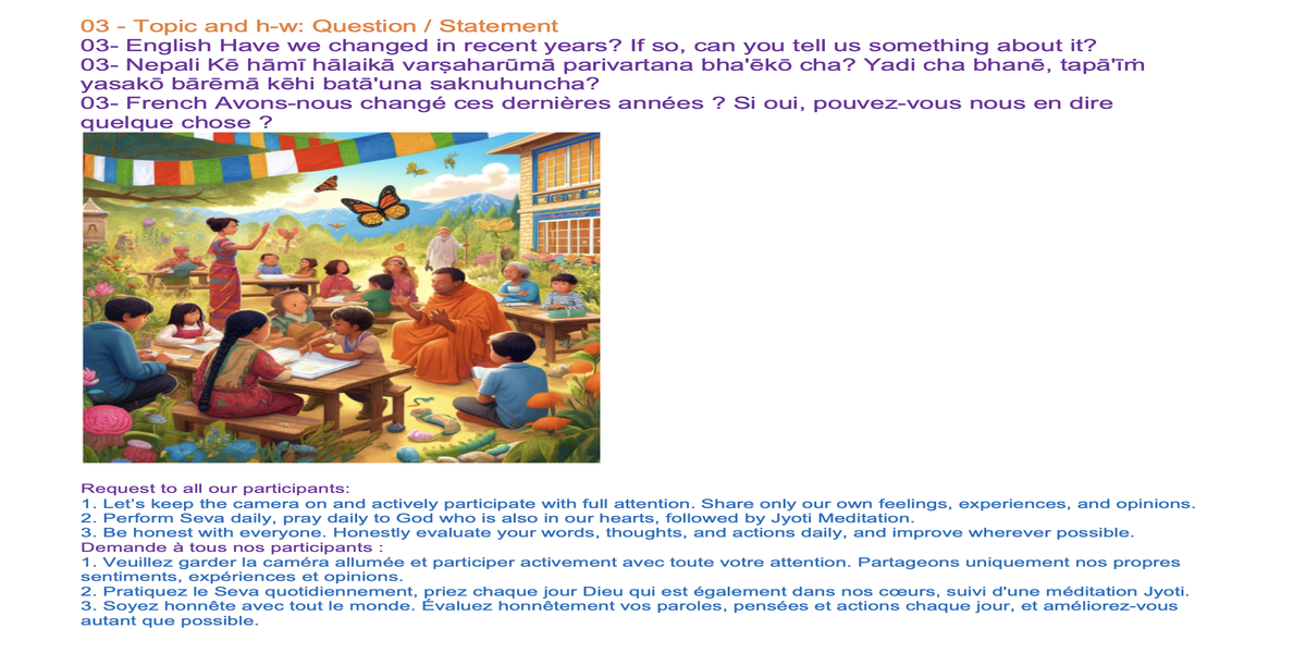 | 04-280suG07 March 31, 2024 | English Have we changed in recent years? If so, can you tell us something about it? | Let's share our experiences and insights through words and/or creative expression, such as art, poetry, music, drama, or drawings, to inspire each other. | Ssssb-guru Daju (Sunil Marapin) Support team: Gurus team | Nepal 18:45-20:00, India 18:30-19:45, Congo: 14:00-15:15, Holland 15:00-16:15 | 07th Gurus class |