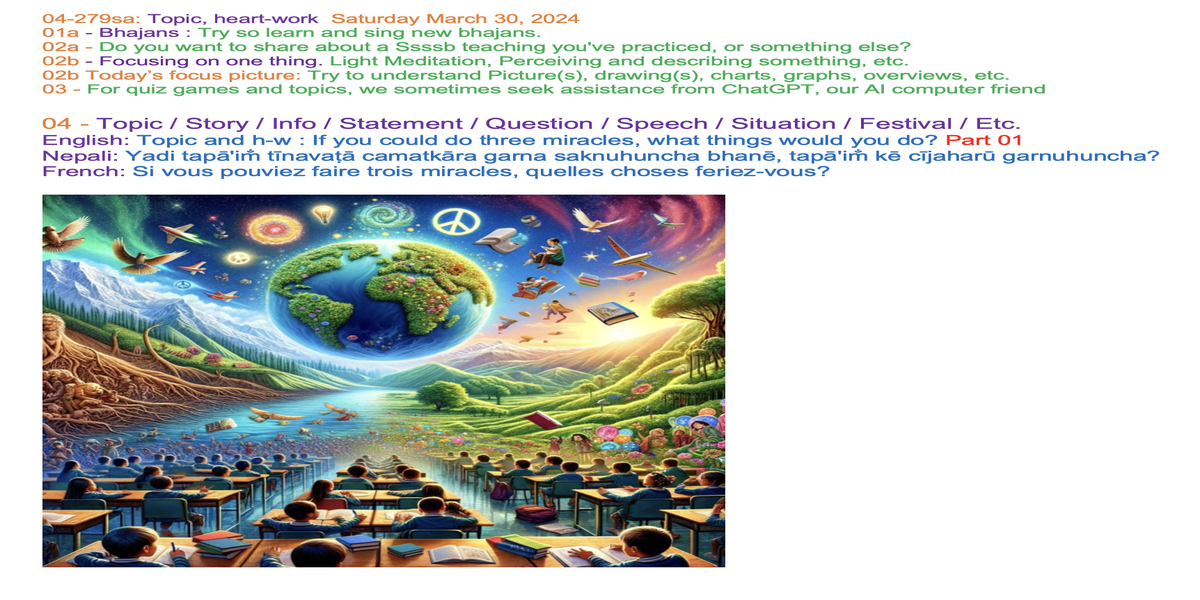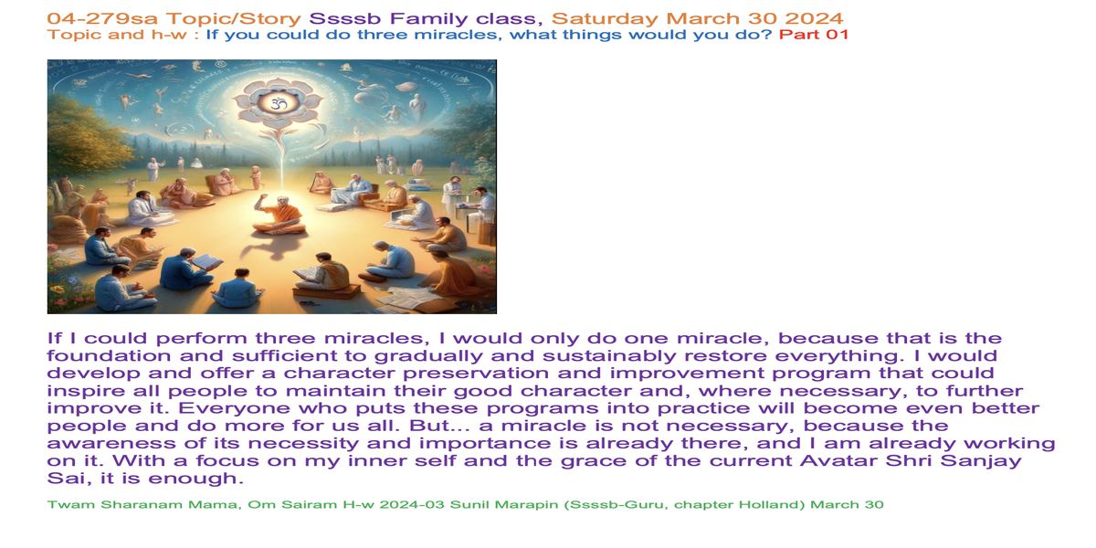 | 04-279sa March 30 | If you could do three miracles, what things would you do? Part 01 | Let's share our experiences and insights through words and/or creative expression, such as art, poetry, music, drama, or drawings, to inspire each other. | Ssssb-guru Daju (Sunil Marapin) Support team: Gurus and Youth team | Nepal 09:00 - 10:15, Congo 4:15-5:30, India 8:45-10:00, Holland 4:15-5:30 | Saturday Family class for everyone |