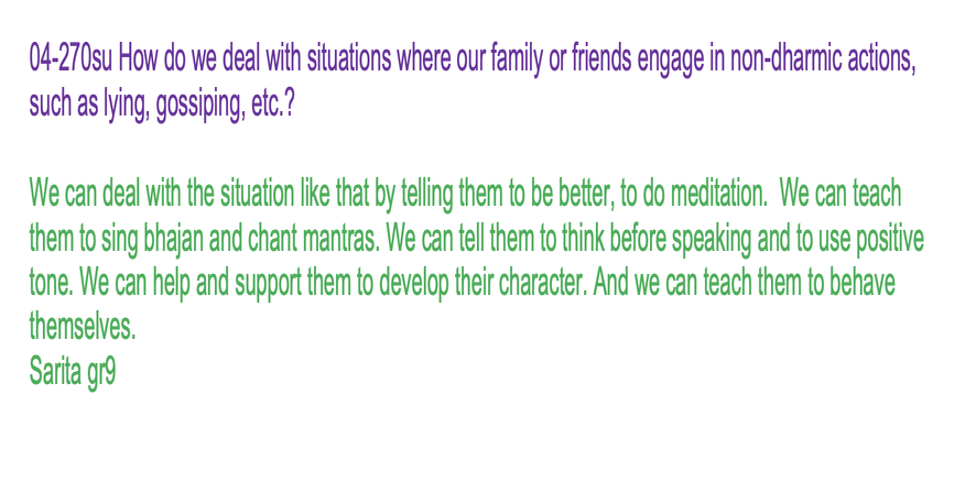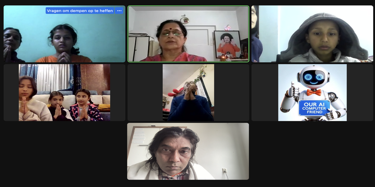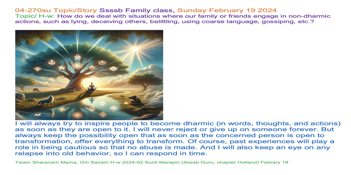 | 04-270su febr 18 | How do we deal with situations where our family or friends engage in non-dharmic actions, such as lying, gossiping, etc.? | Let's share our experiences and insights through words and/or creative expression, such as art, poetry, music, drama, or drawings, to inspire each other. | Ssssb-guru Daju (Sunil Marapin). Support team: Gurus and Youth team | Nepal 18:45-20:00, India 18:30-19:45, Congo: 14:00-15:15, Holland 14:00-15:15 | Sunday Family class for everyone |