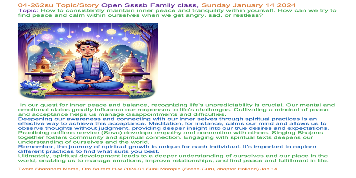 | 04-262su Jan 14, 2024 | How to consistently maintain inner peace and tranquility within yourself. | Let's share our experiences and insights through words and/or creative expression, such as art, poetry, music, drama, or drawings, to inspire each other. | Ssssb-guru Daju (Sunil Marapin). Support team: Gurus and Youth team | Nepal 18:45-20:00, India 18:30-19:45, Congo: 14:00-15:15, Holland 14:00-15:15, Qatar 16:00-17:15 | Sunday Family class for everyone |