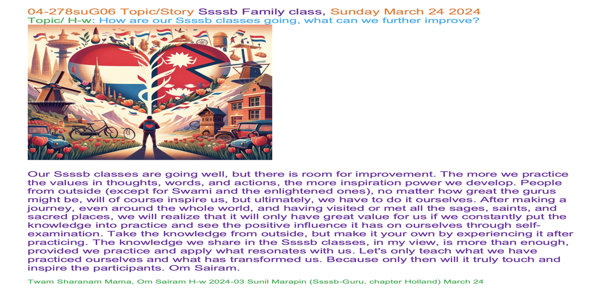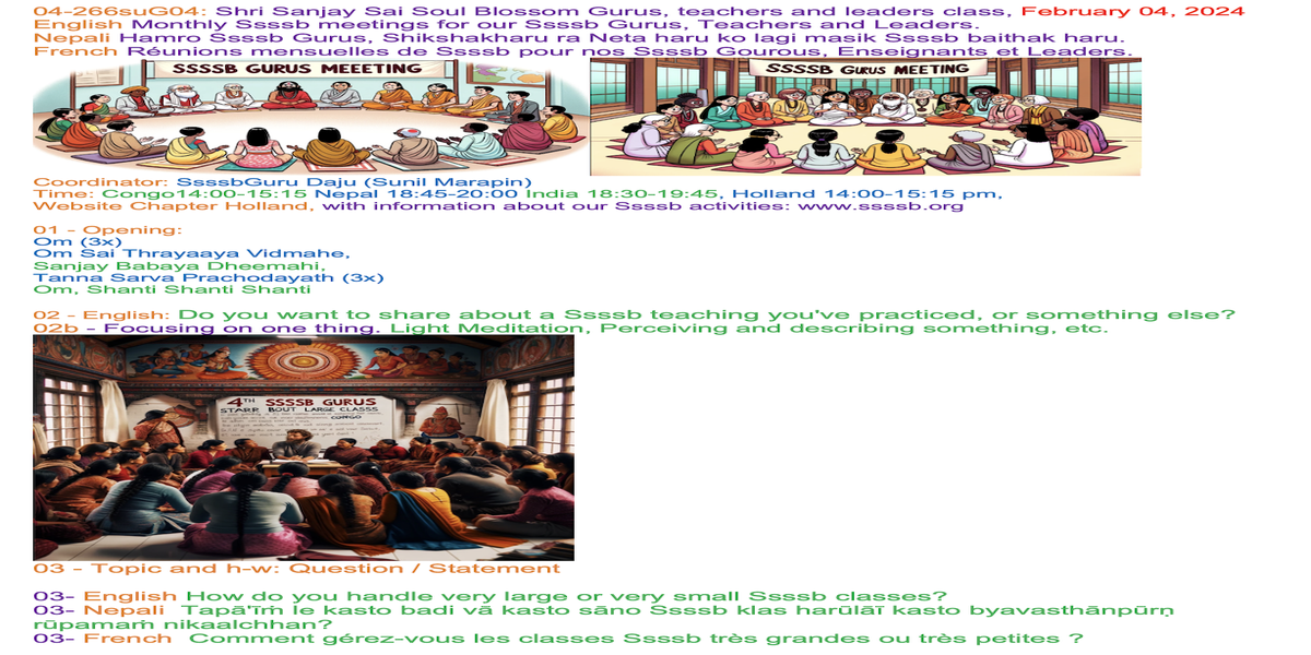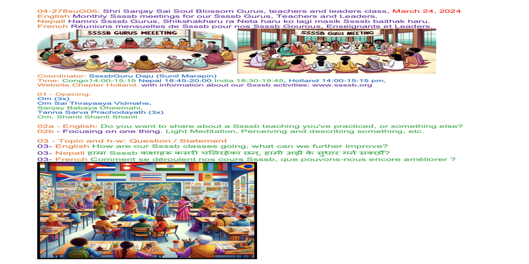 | 04-278suG06 March 24 | How are our Ssssb classes going, what can we further improve? | Let's share our experiences and insights through words and/or creative expression, such as art, poetry, music, drama, or drawings, to inspire each other. | Ssssb-guru Daju (Sunil Marapin) Support team: Gurus team | Nepal 18:45-20:00, India 18:30-19:45, Congo: 14:00-15:15, Holland 14:00-15:15 | 6th Gurus class |