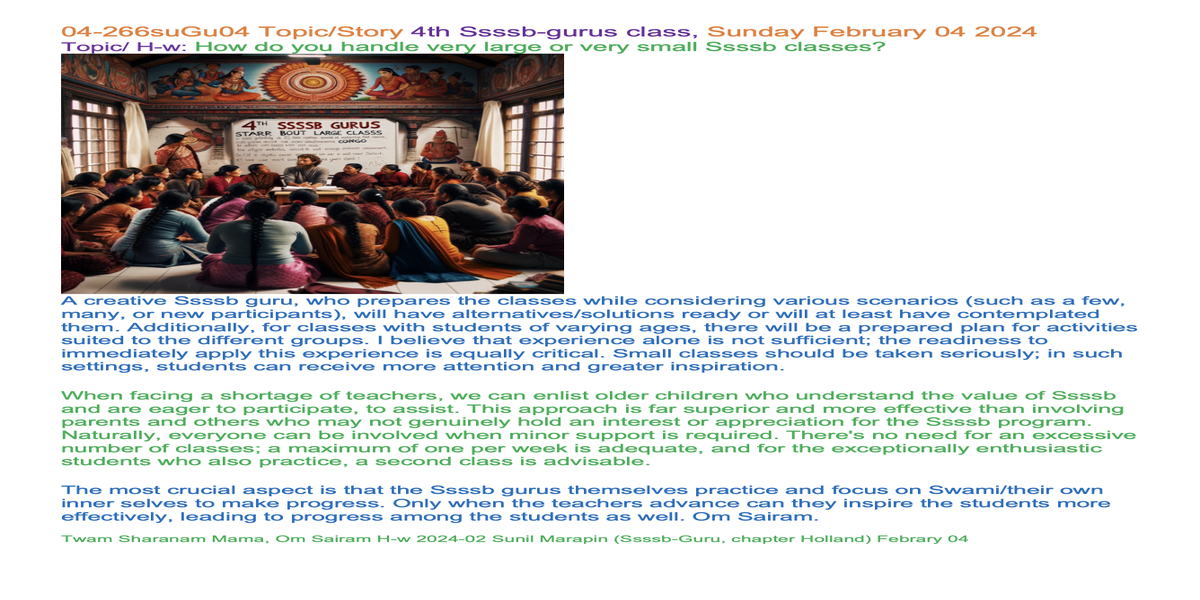 | 04-266suGU04, febr 04 | 4th Gurus class (big/small classes) | Let's share our experiences and insights through words and/or creative expression, such as art, poetry, music, drama, or drawings, to inspire each other. | Ssssb-guru Daju (Sunil Marapin). Support team: Gurus and Youth team | Nepal 18:45-20:00, India 18:30-19:45, Congo: 14:00-15:15, Holland 14:00-15:15, Qatar 16:00-17:15 | 4th Gurus class |