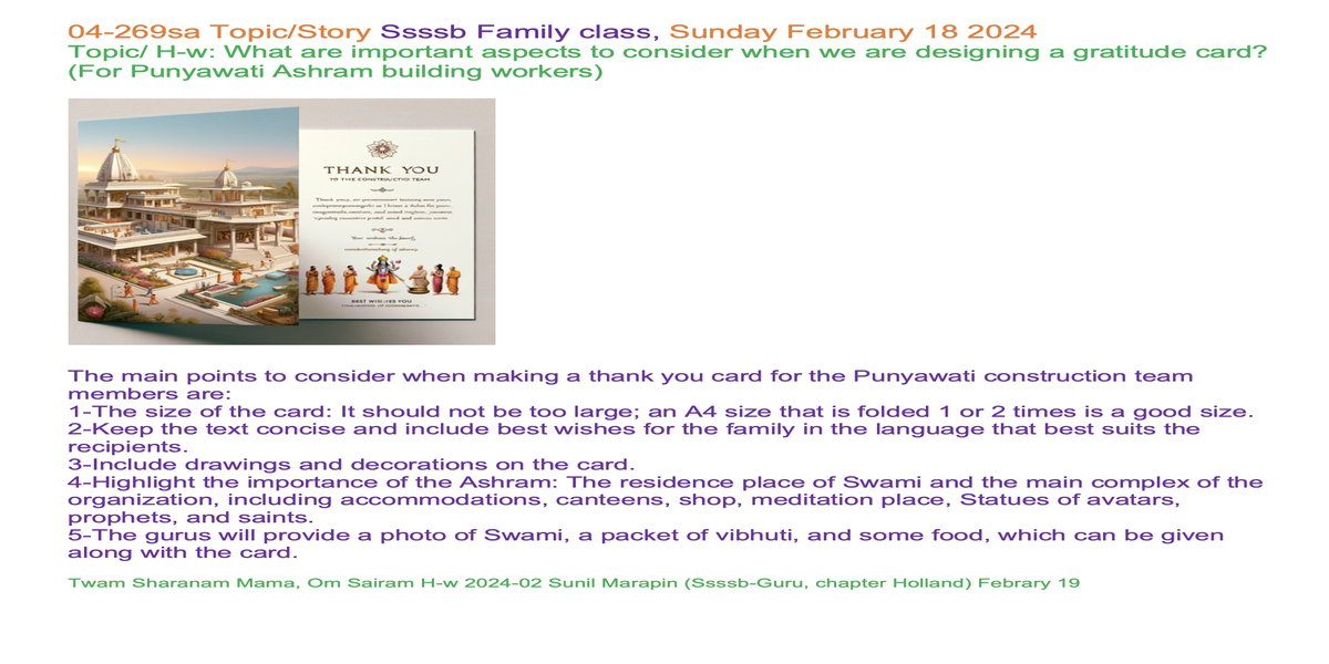 | 04-269sa febr 17 | What are important aspects to consider when we are designing a gratitude card? | Let's share our experiences and insights through words and/or creative expression, such as art, poetry, music, drama, or drawings, to inspire each other. | Ssssb-guru Daju (Sunil Marapin). Support team: Gurus and Youth team | Nepal 09:00 - 10:15, Congo 4:15-5:30, India 8:45-10:00, Holland 4:15-5:30 | Saturday Family class for everyone |