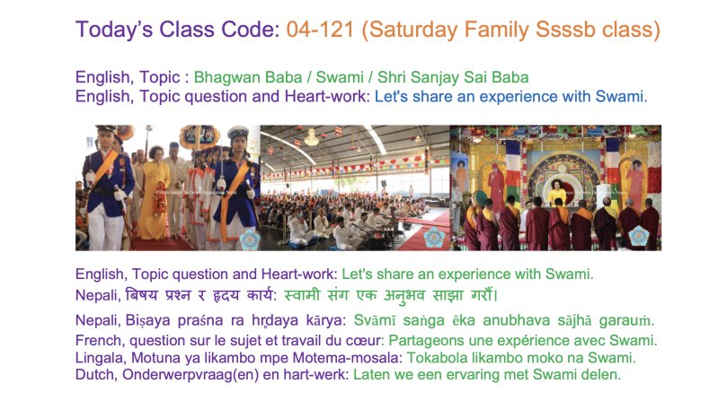 | 04-171 (04-121) | Swami / Bhagvan Baba | Let's share an experience with Swami. | Sunil Marapin | Already done: 2023-January 21, Saturday SSSSB Family class | |