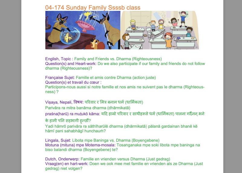 | 04-174 (07-52) | Family and Friends vs. Dharma (Righteousness) | Do we also participate if our family and friends do not follow dharma (Righteousness)? | Sunil Marapin | Already done: 2023-January 29, Sunday SSSSB Family class | |